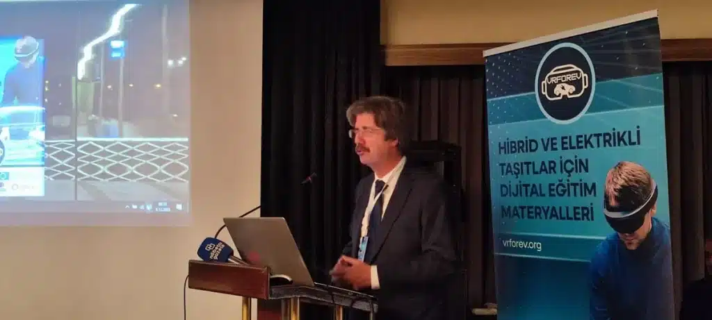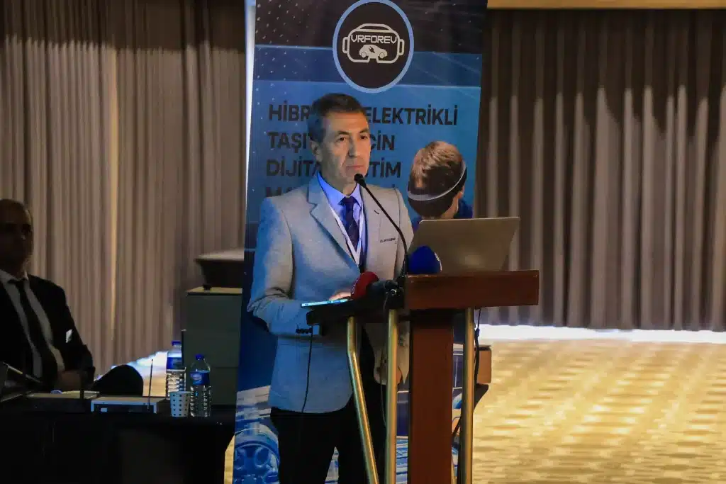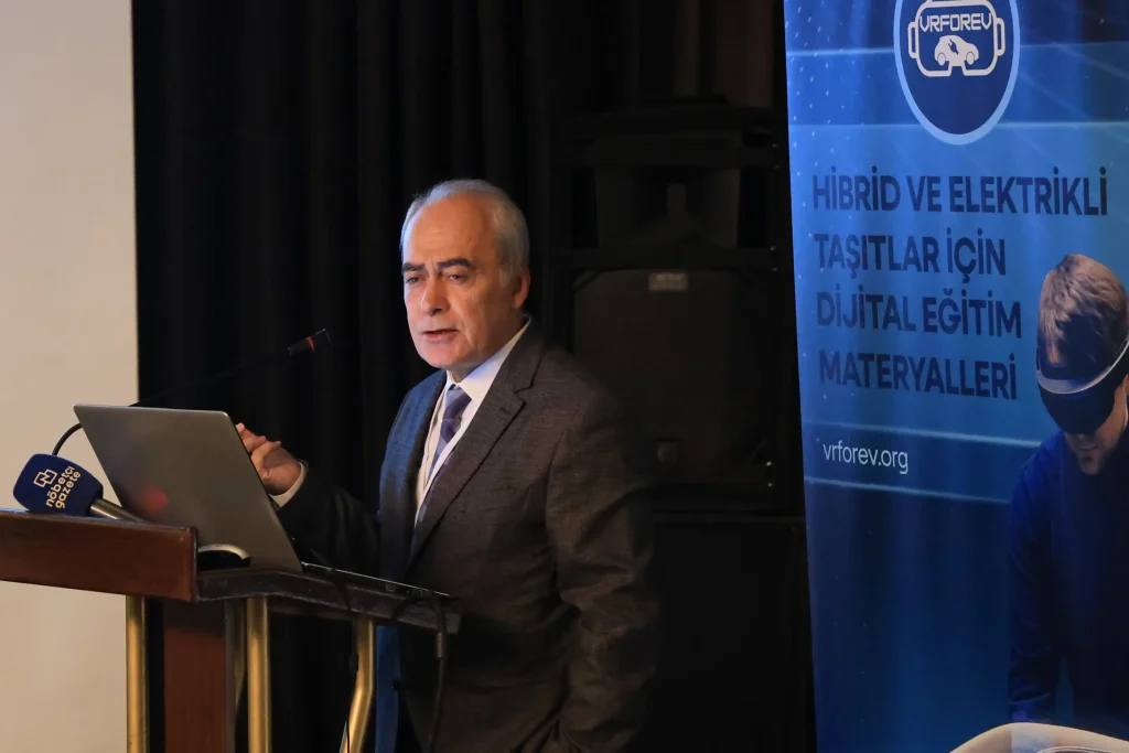 Proje Koordinatörü Prof. Dr. Abdil Kuş ise projenin genel tanıtımını yaparak artan elektrikli araç satışlarına karşılık nitelikli teknik personel ihtiyacının, yüksek ekipman maliyetlerinin ve güvenli eğitim ortamı gereksiniminin projenin temel gerekçelerini oluşturduğunu ifade etti. Projenin genel amacının, bu alanda nitelikli eleman ihtiyacına katkı sağlamak, mesleki eğitimin kalitesini ve erişilebilirliğini artırmak olduğunu vurguladı. Proje kapsamında ihtiyaç analizi yapıldığını, dört modül altında içerik ve senaryo geliştirildiğini, VR uygulamalarının hazırlandığını ve İngilizce bir kitap basıldığını ifade etti. Ayrıca, uygulamanın performans ve fiyat açısından memnuniyet veren Meta Quest 3 gözlüğü kullanılarak geliştirildiğini ve bilgilendirme amaçlı beş, etkileşimli senaryo amaçlı yirmi bir bölüm içerdiğini aktardı. Tüm proje çıktılarına ve uygulamalara vrforev.org adresinden ulaşılabileceğini sözlerine ekledi.